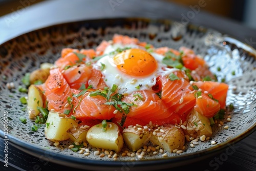 Salmon slices with fried egg and roasted potatoes, decorated with fresh herbs and sesame seeds, served on a plate
