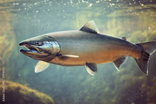 Salmon swimming gracefully in vibrant underwater habitat during daylight, salmon fish in the water