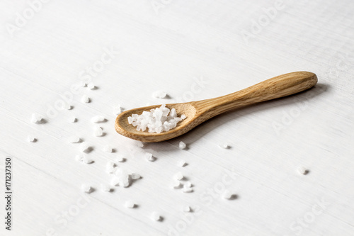 salt crystals on wooden spoon