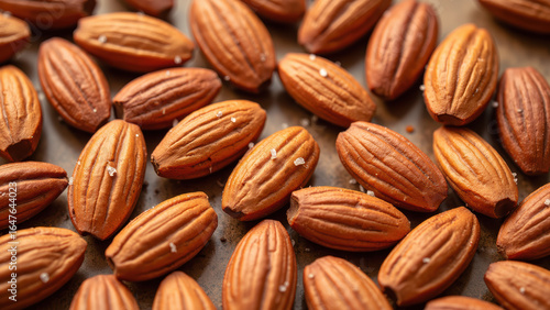 Salted almonds scattered on wooden surface create delightful and crunchy snack. Their rich texture and flavor make them popular choice