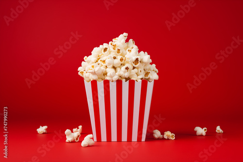 Salted popcorn in a little striped box on red background with copy space. Classic snack on cinema date concept.