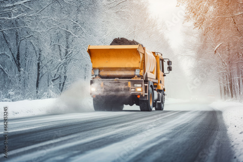 Salting the highway maintenance truck on road. Snow plow truck on snowy road. Road safety in winter conditions.