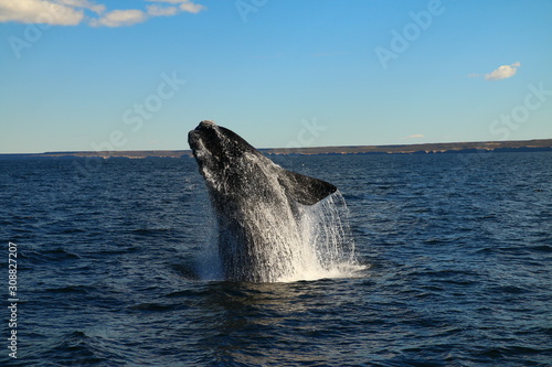 salto de ballena franca austral vista desde visita turistica embarcada en Puerto Piramides, peninsula de valdes, Argentina