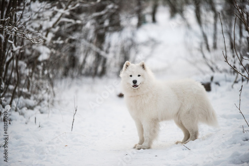 Samoyed white dog is on snow background outside