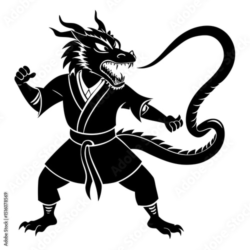 Samurai Dragon Warrior – Fierce Mythical Creature with Katana in Combat Stance (Black and White Ink Illustration)"