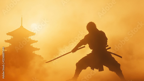 Samurai Ninja Warrior With Katana Sword In Combat Stance Near Temple Sunset