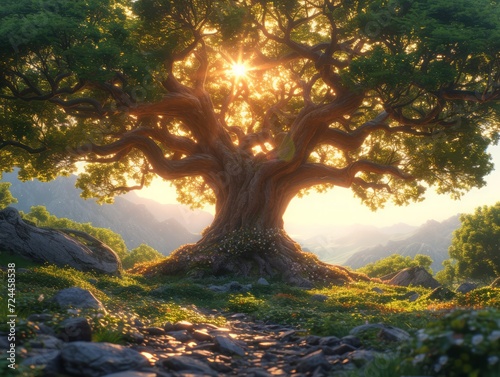 Sanctuary in the Sky: A Majestic Tree Basking in Ethereal Light, Floating Above the Clouds in a Surreal Display of Nature's Splendor, Generative AI