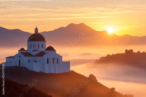 Sanctuary of Saint Michael of the Archange, golden sunrise illuminating fog over the hills of Puglia