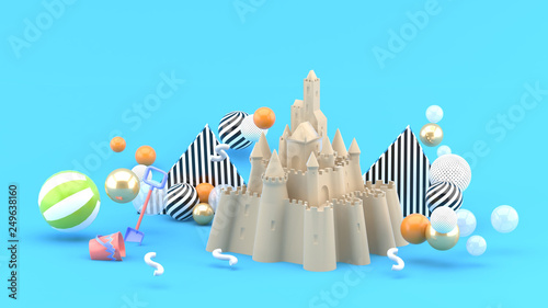 Sand castle amidst colorful balls on blue background.-3d rendering.