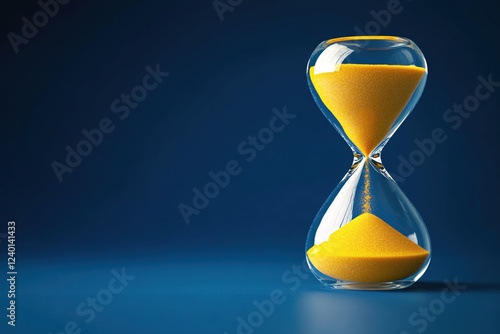 Sand timer with yellow grains on a dark blue background symbolizing passing time and deadlines