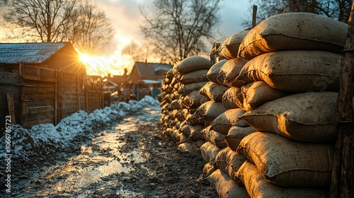 Sandbags lining a muddy path at sunset