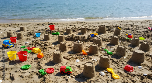 Sandcastles and toys on a sunny beach by the sea.