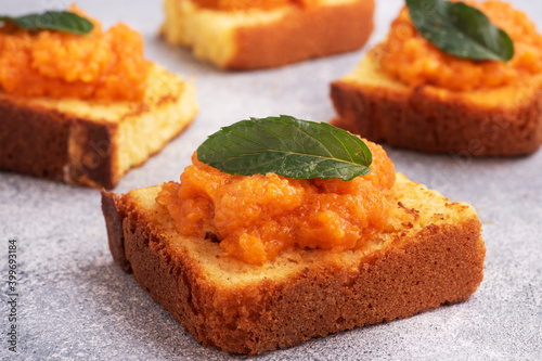 Sandwich with toast and zucchini caviar. Vegetable caviar on bread, a healthy vegetarian snack. Close up.