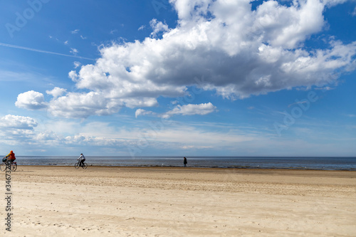 Sandy beach by the sea on a sunny day with white cumulus clouds in the sky.