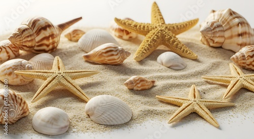 Sandy Beach Treasures Seashells and Starfish Collection on Soft Sand, evoking summer memories and coastal themes