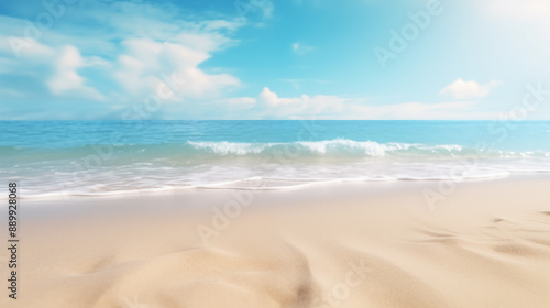Sandy beach with gentle waves and a clear blue sky creating a tranquil tropical scene ideal for relaxation and summer vacations.