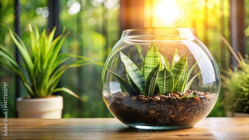 Sansevieria plant in a modern glass terrarium with filtered sunlight and misty atmosphere