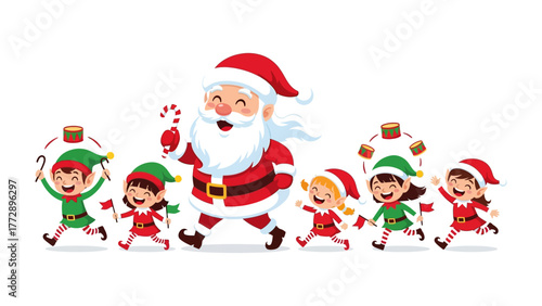 Santa and His Cheerful Elves: A jolly Santa Claus leads a procession of cheerful elves. conveying festive spirit and seasonal merriment.