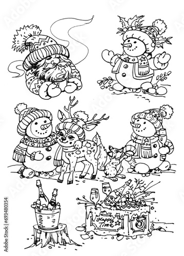 Santa Claus and reindeer pen drawing for card illustration decoration