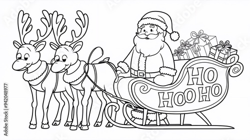 Santa Claus and reindeer with sleigh and bag of gifts. Coloring book for children.