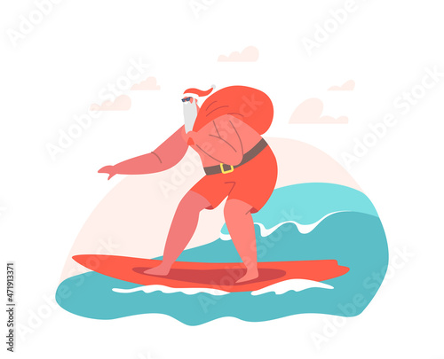 Santa Claus Character Wearing Christmas Hat and Red Shorts Surfing Ocean Wave on Surf Board. Tropical Summer Vacation