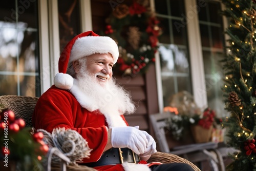 Santa Claus closeup portrait sitting near classic Christmas decorated house with gifts. Xmas holiday season postcard.