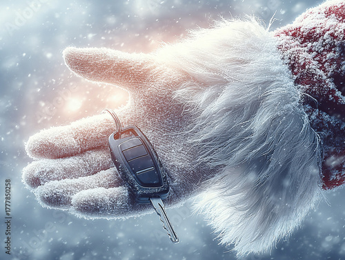 Santa Claus gives you the keys, holds them in his hand. Close-up. A gift for New Year or Christmas. Poster, wallpaper.