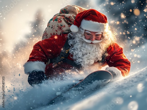 Santa Claus is carrying a big bag of presents on his back, hurriedly snowboarding, breaking through the snow. Sunlight shines down from snow-covered mountains, smiling face, a joyful Christmas scene.