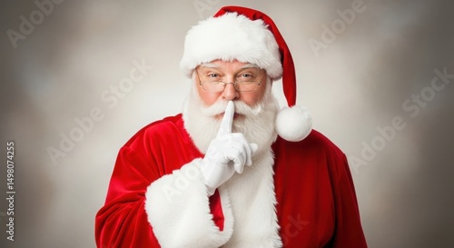 Santa Claus making a shushing gesture against a gray background