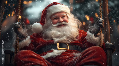 Santa Claus on a swing in snowy surroundings. Happy new year