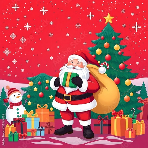 Santa Claus with Gifts, Christmas Celebration Scene, Festive Holiday Illustration, Merry Christmas Vector - Santa with Presents and Holiday Decorations, Christmas Cheer Santa Claus Holding Background