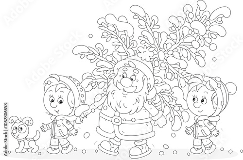 Santa Claus with happy little girl and boy carrying a snowy fir from a winter forest to decorate it to Christmas, black and white outline vector cartoon illustration for a coloring book page
