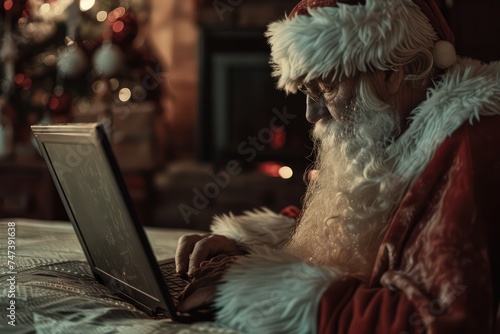 santa claus with his laptop, writing mail to kids, screen format, white, close up