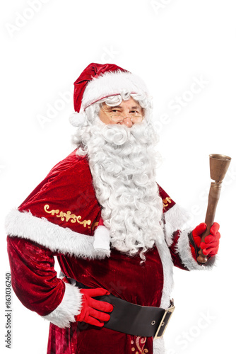 santa claus with ring bell studio portrait on white background
