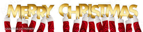 santa clause hands holding up merry christmas greeting golden shiny metal letters lettering isolated wide panorama background