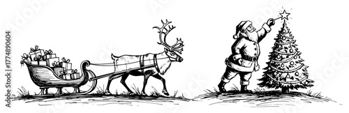 Santa Decorating Christmas Tree Beside Sleigh – Detailed Christmas Holiday Winter Vector Illustration