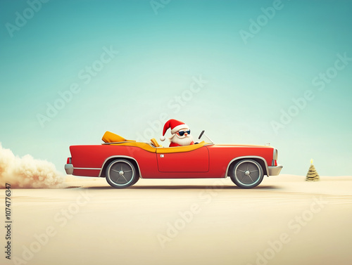 Santa driving a colorful convertible car through a snowy landscape, spreading holiday cheer in festive attire during winter