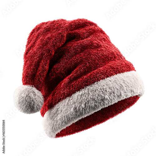 Santa Hat in Festive Red: A vibrant, plush Santa hat, its rich red fabric contrasting beautifully with the snowy white trim and pom-pom.
