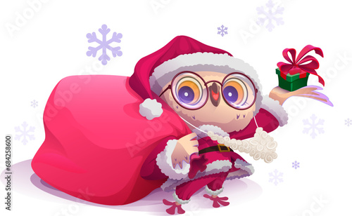 Santa owl bird and bag full of Christmas gift symbol xmas party