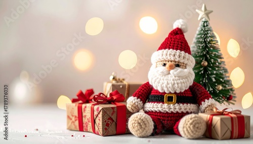 Santa Sitting Beside Gift Pile Under Tiny Christmas Tree Crochet Doll
