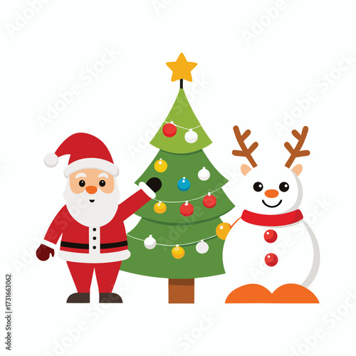 Santa Snowman and Reindeer Decorating Christmas Tree Vector Illustration