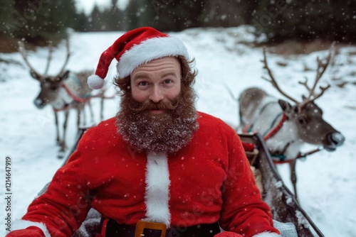 Santa's iconic sleigh ride with reindeer, ideal for Christmas promotions or winter season themes