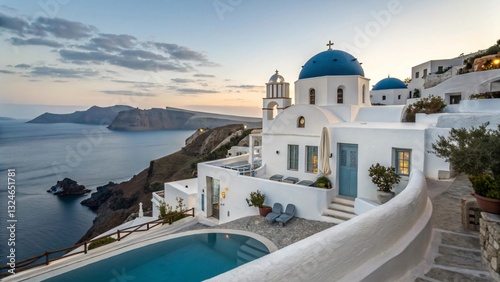 Santorini Greece: Blue-Domed Churches, White-Washed Buildings, Aegean Sea Views, Cliffside Architecture, Idyllic Mediterranean Travel Destination.