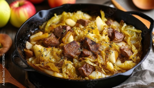 Sartén de col estofada con trozos de cerdo y manzanas, decorada con hojas otoñales y frutas frescas en una mesa de madera.