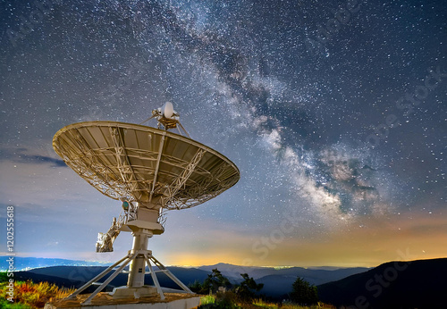 satellite dish against a night sky with milkyway