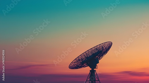 Satellite dish and communication tower silhouette against a gradient sky, representing global telecommunications