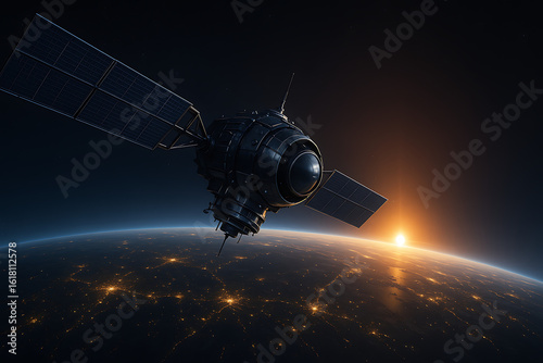 Satellite flying in low earth orbit with glowing solar panels and sunrise light illuminating dark planet surface under deep space filled with distant stars