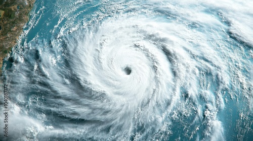 Satellite image of a massive hurricane approaching a densely populated coast.
