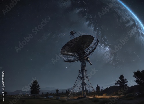 Satellite in starry night sky, powerful internet antenna, light, data transmission, communication