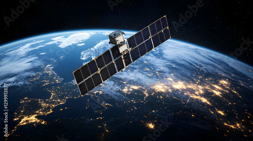 Satellite orbiting Blue Planet with illuminated cities at Night in Space Perspective View